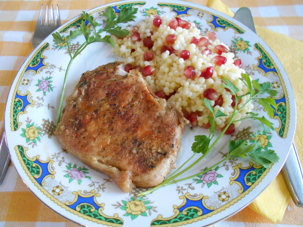 Cotlete de porc la tava, cu garnitura de cus-cus si rodie