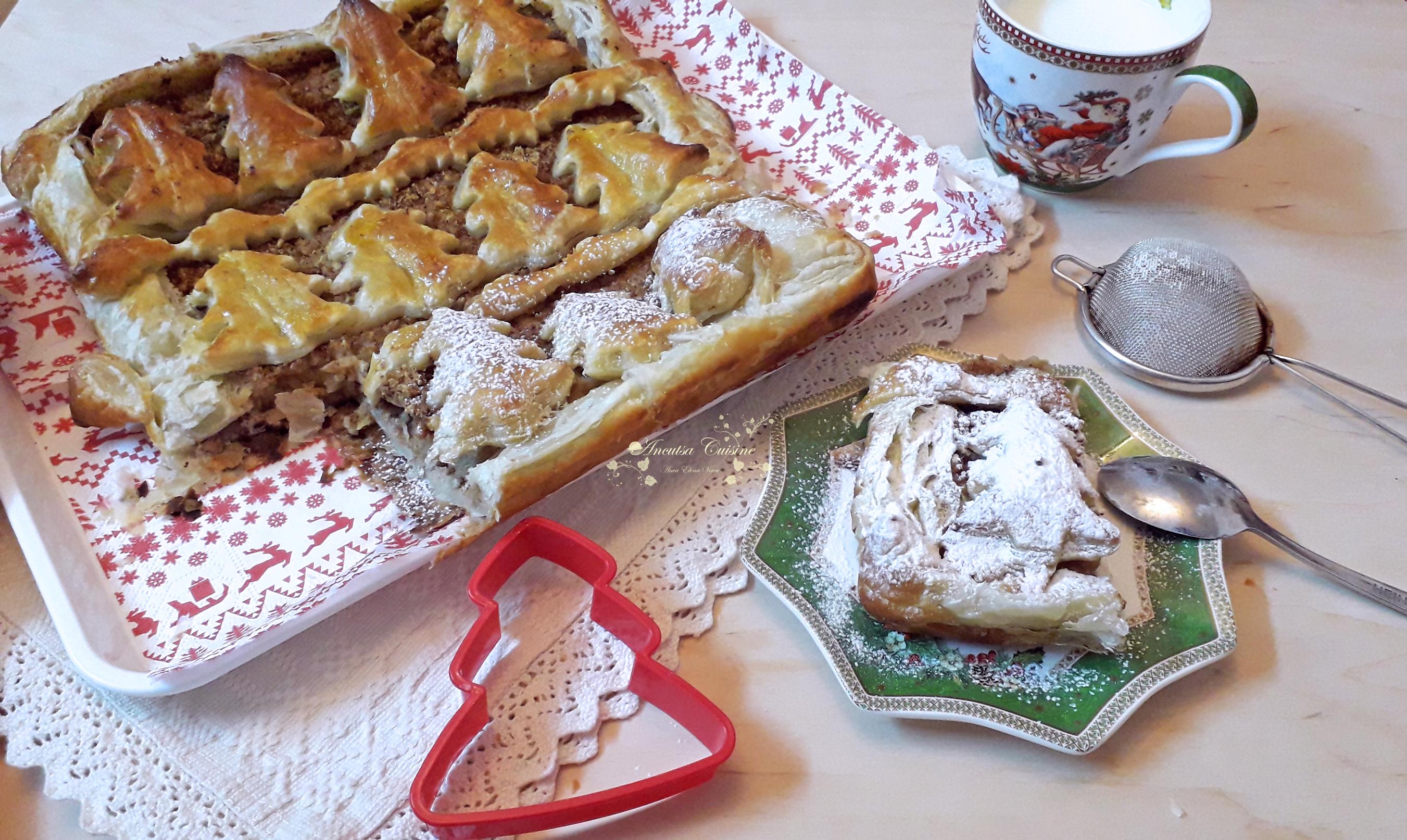 Desert foietaj cu mere, nuci rumenite si rom