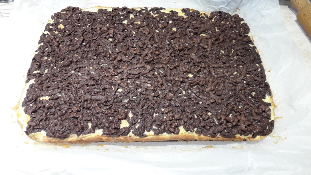 Desert prajitura razuita cu blat de cacao si umplutura de mere si branza