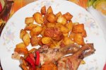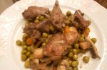 Carnea se condimenteaza, se stropeste cu ulei de masline si se adauga putin vin alb si se lasa la marinat timp de 2 ore la rece. Se pune la prajit, se pune apa cat sa acopere carnea si se lasa la foc mediu. Dupa ce a scazut daca mai e nevoie se mai completeaza cu putina apa si se adauga si...