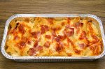 Punem cartofii la fiert cu sare. Intr-o tigaie la foc mediu punem uleiul si gatim usor ceapa ,usturoiul si baconul. Ungem un vas termorezistent cu putin unt,punem un strat de cartofi taiati felii,sare,piper si amestecul din tigaie,putina branza rasa si celalalt strat de cartofi, sare, piper...
