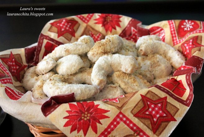 Intr-un alt castron, am pus toate cornuletele, am presarat mult zahar pudra vanilat si am vanturat castronul pana s-au imbracat toate in zahar.