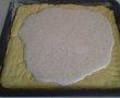 Incalzim cuptorul la 160°.Ungem tava de cuptor cu margarina,tapetam cu faina si intindem aluatul.Dam tava la cuptor timp de 15 min.Trebuie sa se coaca pe jumatate.