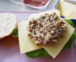 Am pregătit prima oară sosul de ciuperci. Este foarte ușor de realizat și e nevoie doar de trei ingrediente: unt, ciuperci și smântână dulce. Am ras două ciuperci într-o crăticioară, am adăugat untul și le-am tras ușor la tigaie. Când apa pe care acestea o lasă se evaporă am adăugat o lingură cu smântână dulce amestecând continuu. Am mutat sosul într-un alt vas pentru a se răci și m-am apucat de sandwich.