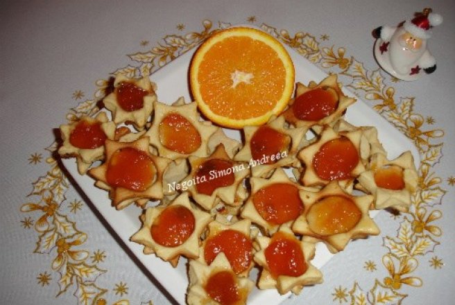 Se incalzeste pe aburi restul de gem si se amesteca cu sucul de portocale. Cu acest amestec cald inca se umplu gaurile stelutelor. Se servesc pe felii de portocale coapte.