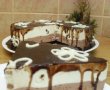 Cand blatul s-a racit il asezam pe o tava cu pereti detasabili. Turnam peste blat crema de cacao, apoi pe cea cu vanilie. Lasam la frigider 2-3 ore pana se intaresc cremele. Detasam peretii formei si mutam tortul pe un platou.