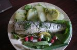 curatati pestele,il eviscerati,il spalati repede sub jet de apa rece,ii indepartati capul si-l despicati de-a lungul osului principal. ungeti o tava cu putin ulei,asezati pestele,presarati-l cu sare si piper dupa gust si il ungeti cu mujdeiul de usturoi (pisati cateii de usturoi si...